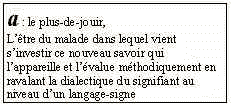 a : le plus-de-jouir. Lêtre du malade dans lequel vient sinvestir ce nouveau savoir qui lappareille et lévalue méthodiquement en ravalant la dialectique du signifiant au niveau dun langage-signe.